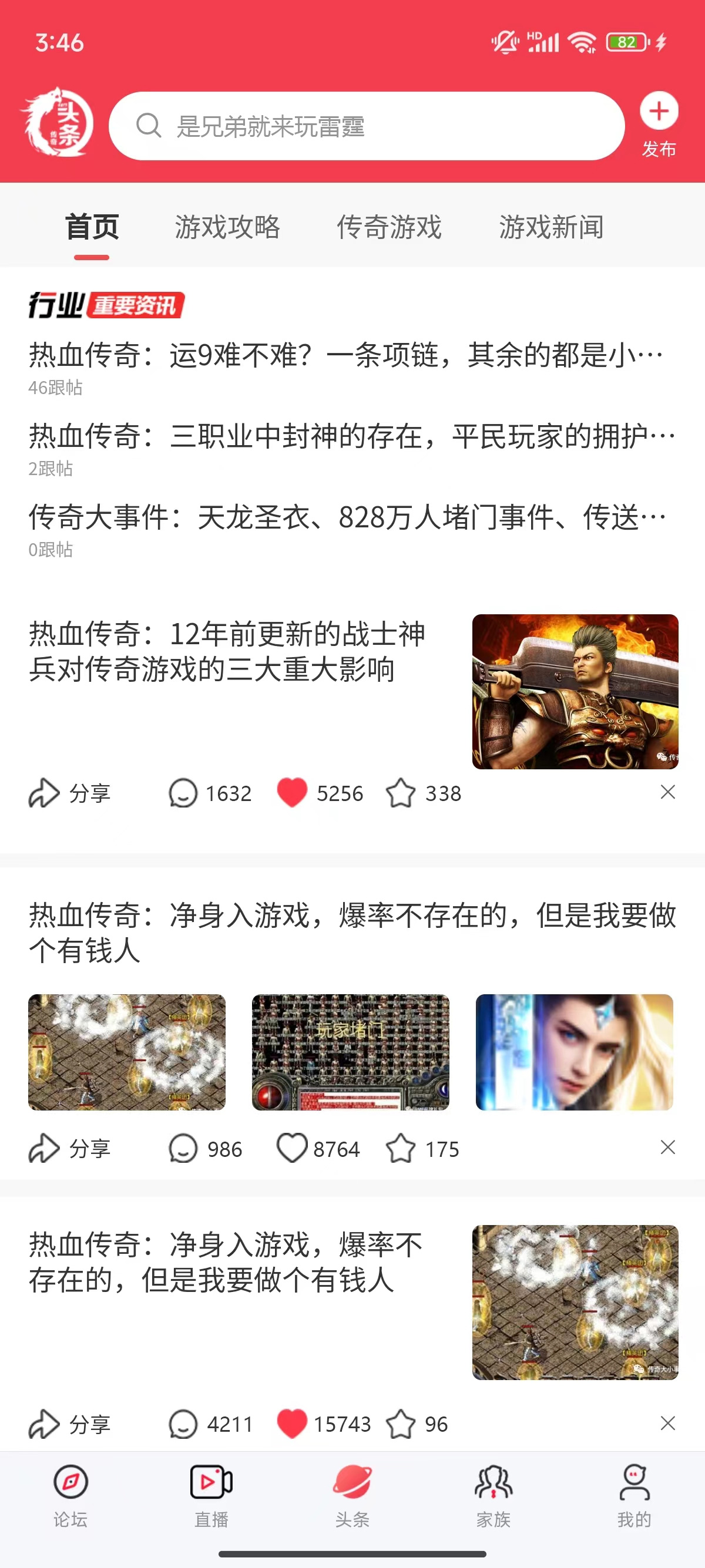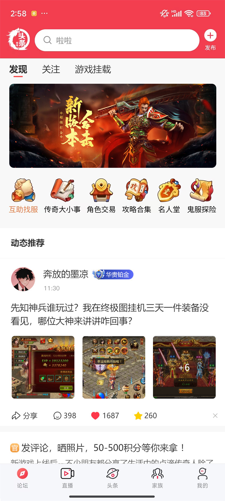 傳奇頭條分為五大模塊:論壇、直播、頭條、家族、個人中心。